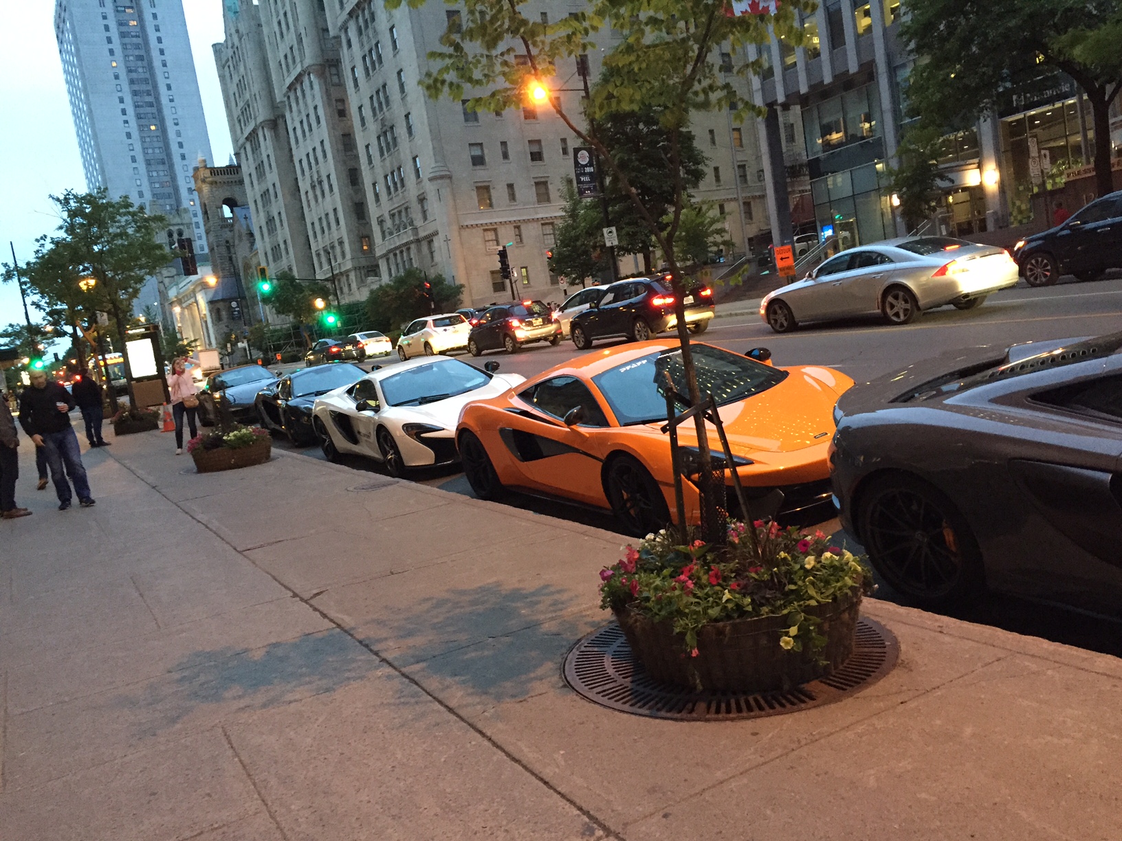 A line of McLarens parked in front of the Ritz-Carlton Hotel